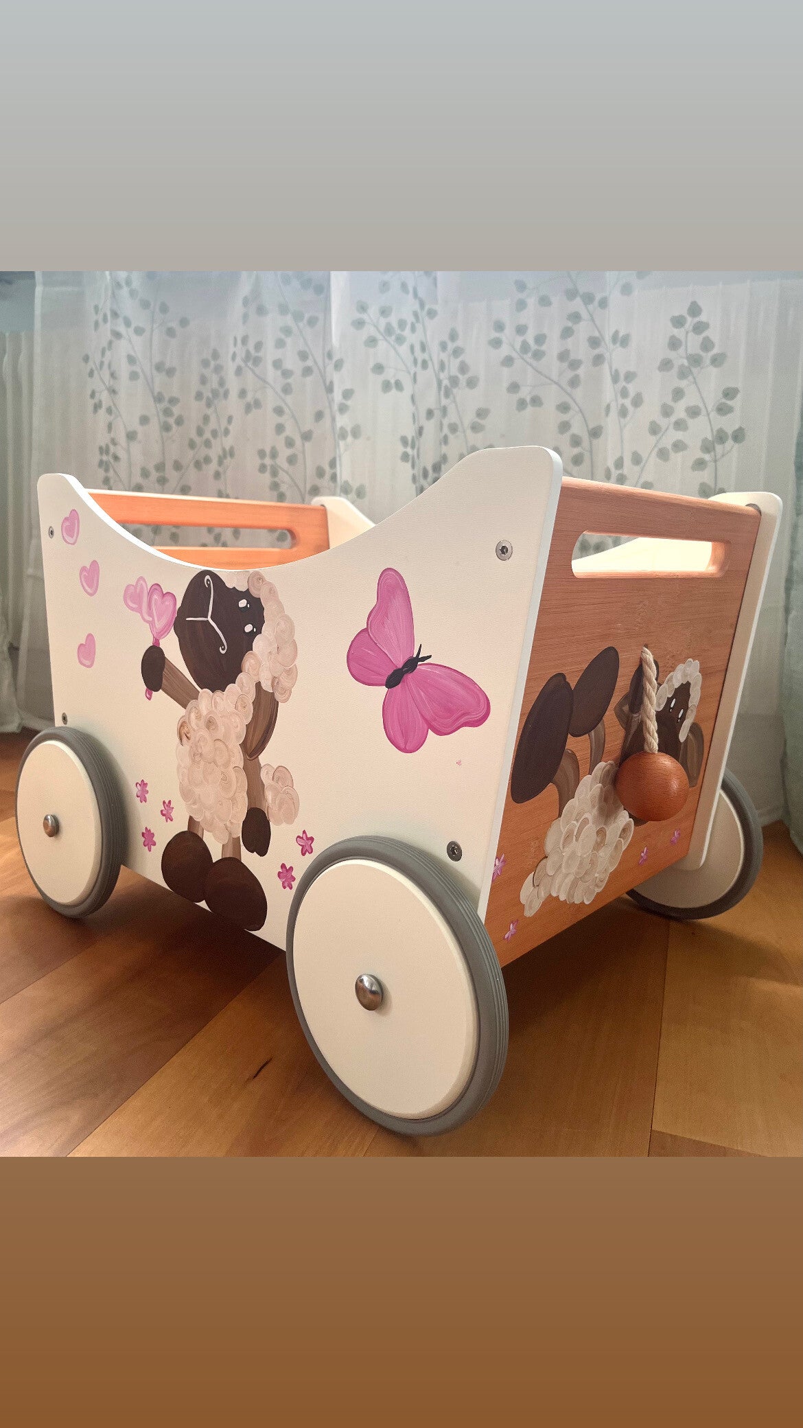 Neu im Sortiment die süsse Spielzeugkiste mit Gummirädern, auch als Lauflernhilfe einsetzbar.